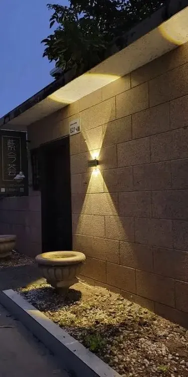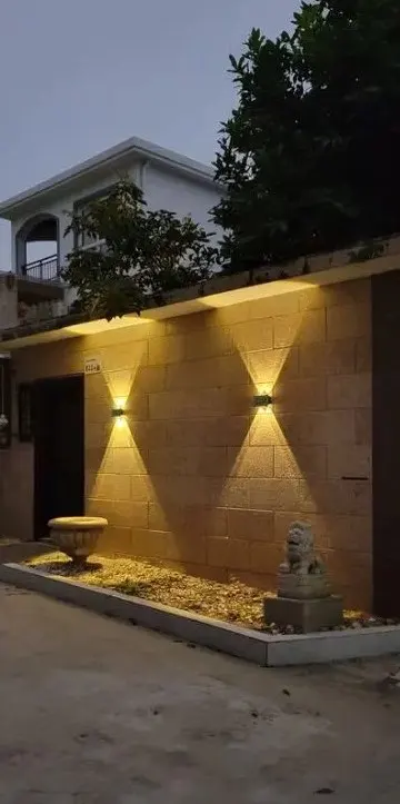 Durable solar-powered LED wall lamp featuring up-and-down lighting, ideal for outdoor decoration and illumination of balconies, gardens, and exterior house walls. Waterproof IP65 design ensures long-lasting performance in all weather conditions.